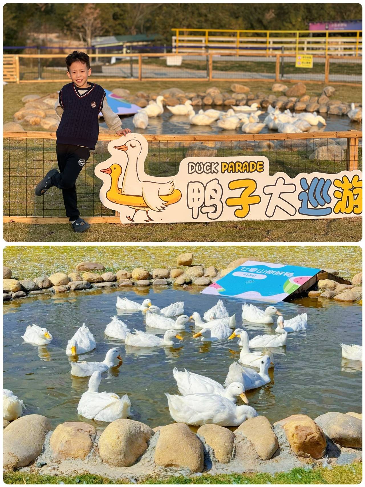园内项目:鹿园、兔子屋、山羊区、鸭子大巡游、小猪赛跑表演、淘金区体验一次(限儿童票使用)、捉小猪抵扣劵5元(门市收费15元每次)、喂养动物需自费。