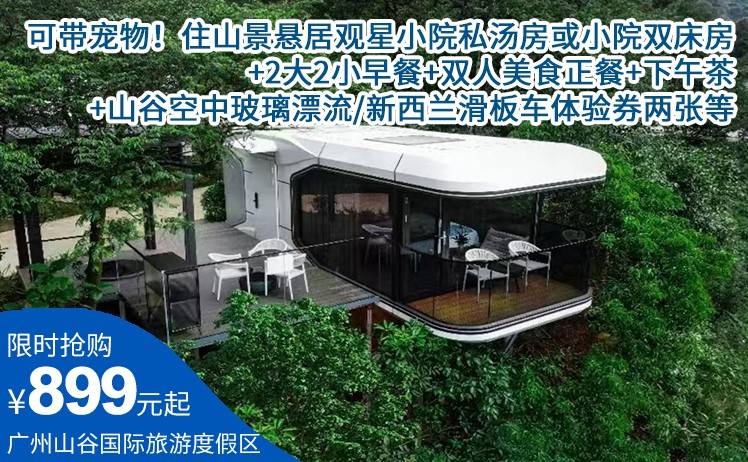 【广州山谷国际旅游度假区】可带宠物!899元入住山景悬居观星小院私汤房或小院双床房+2大2小早餐+双人美食正餐+下午茶+山谷空中玻璃漂流/新西兰滑板车体验券两张等