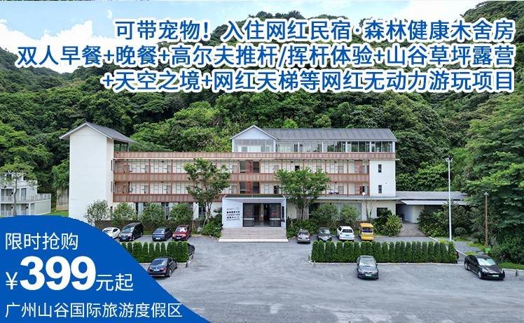 【广州山谷国际旅游度假区】可带宠物!399元起山谷美食盛宴套票,入住网红民宿·森林健康木舍房;双人早餐+晚餐+高尔夫推杆/挥杆体验+山谷草坪露营+天空之境+网红天梯等网红无动力游玩项目