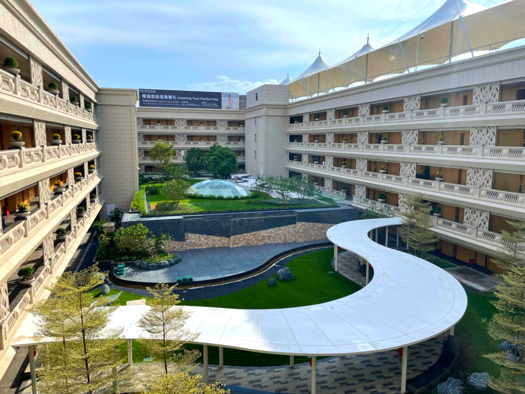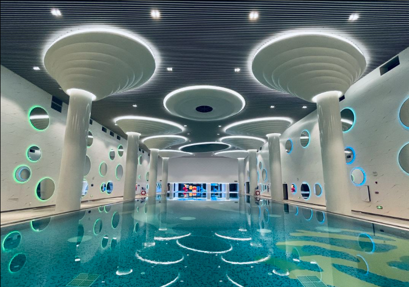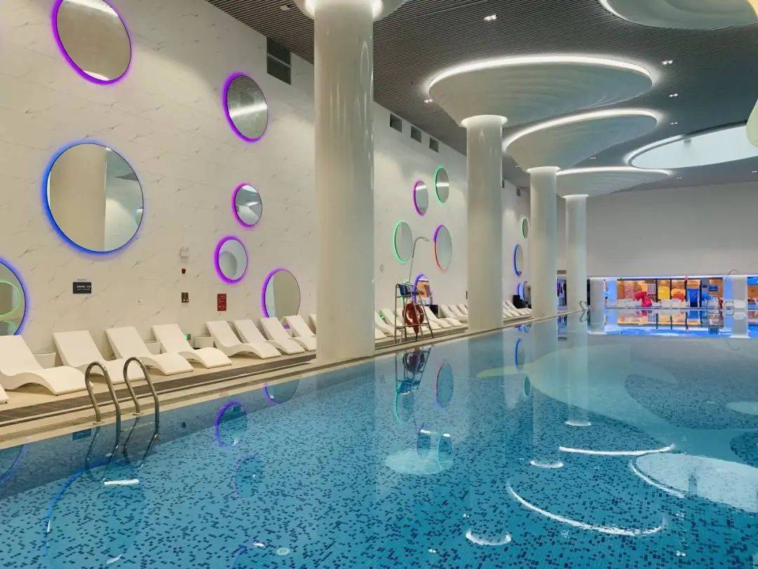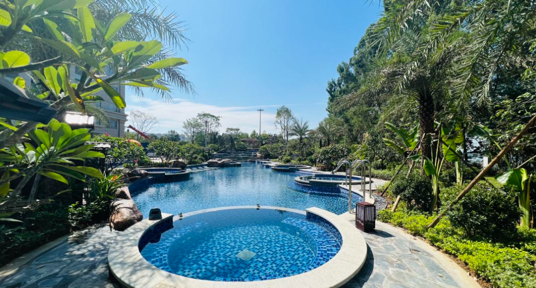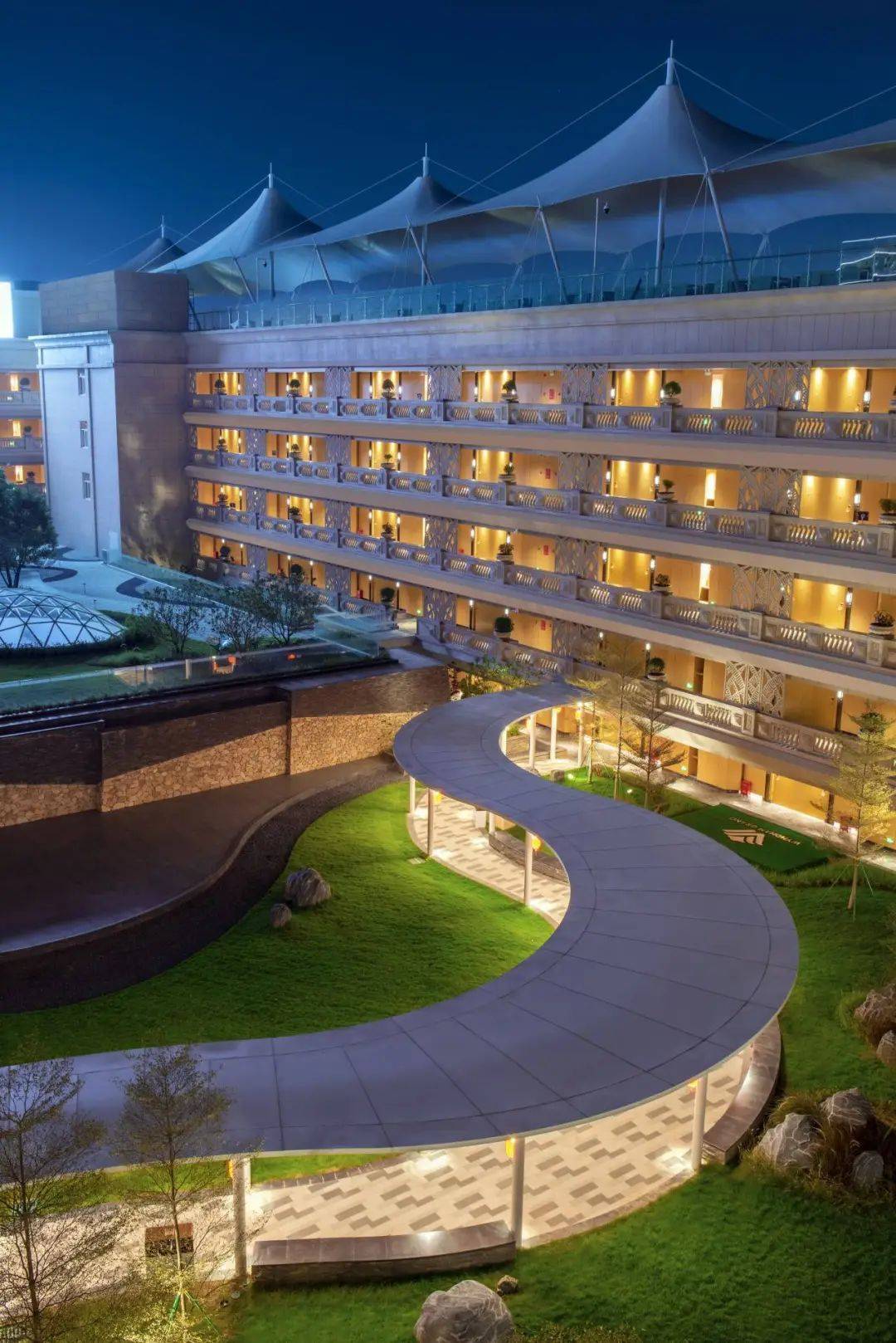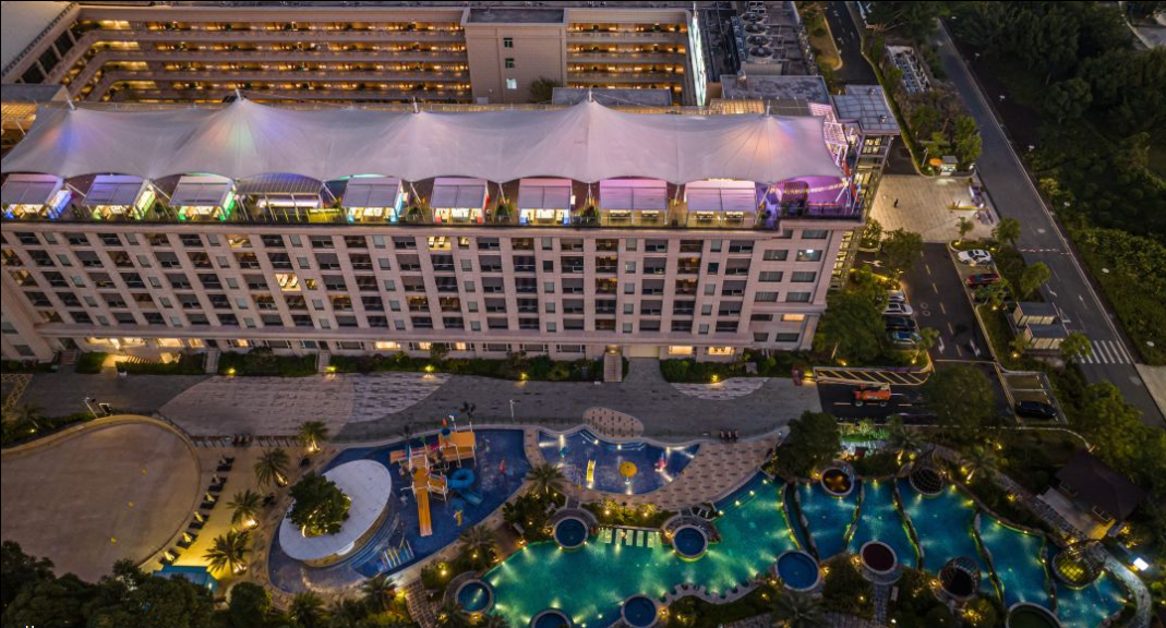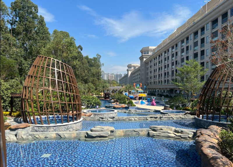 内有小桥流水,室内外泳池、冲浪、水上乐园及网球场