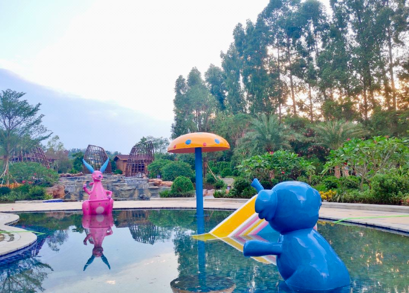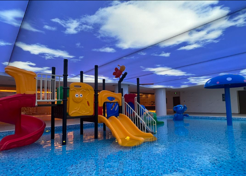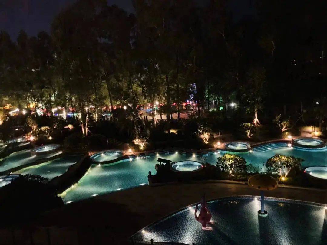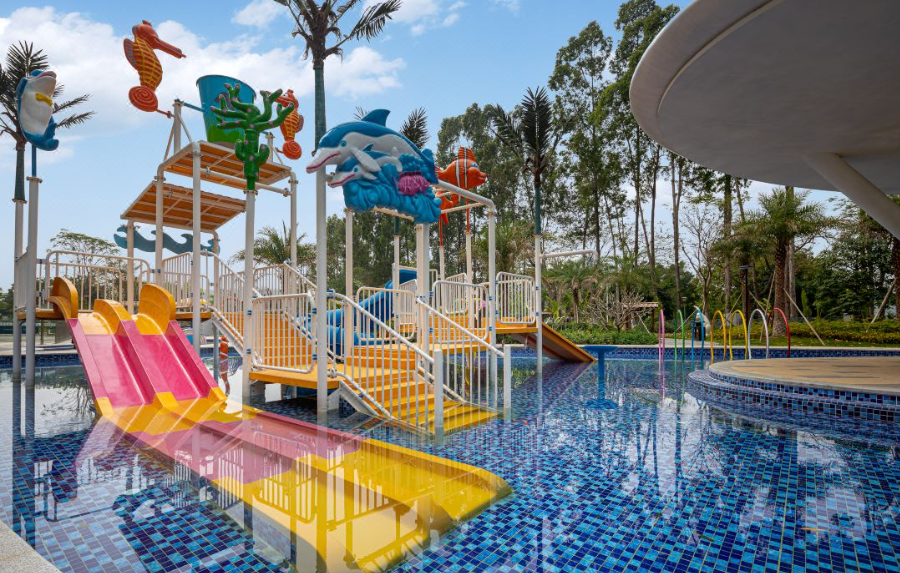 内有小桥流水,室内外泳池、冲浪、水上乐园及网球场