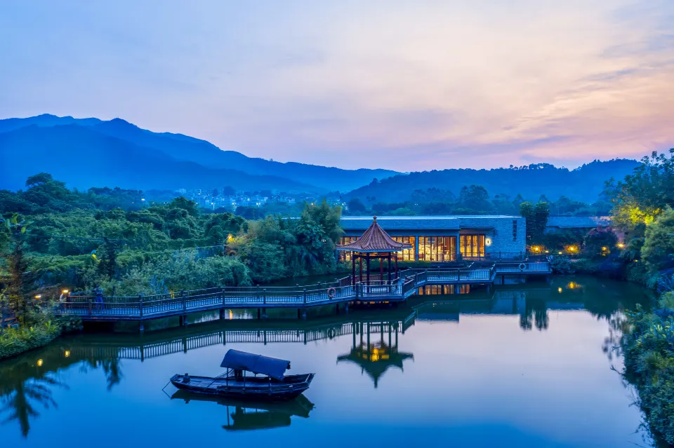 湖中修建木栈道、双层仿古六角亭、船舶码头、水栈道等自然生态景观