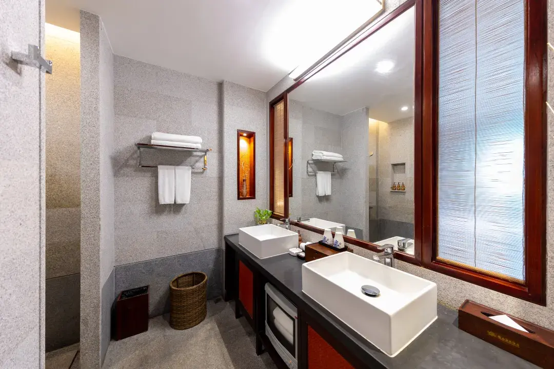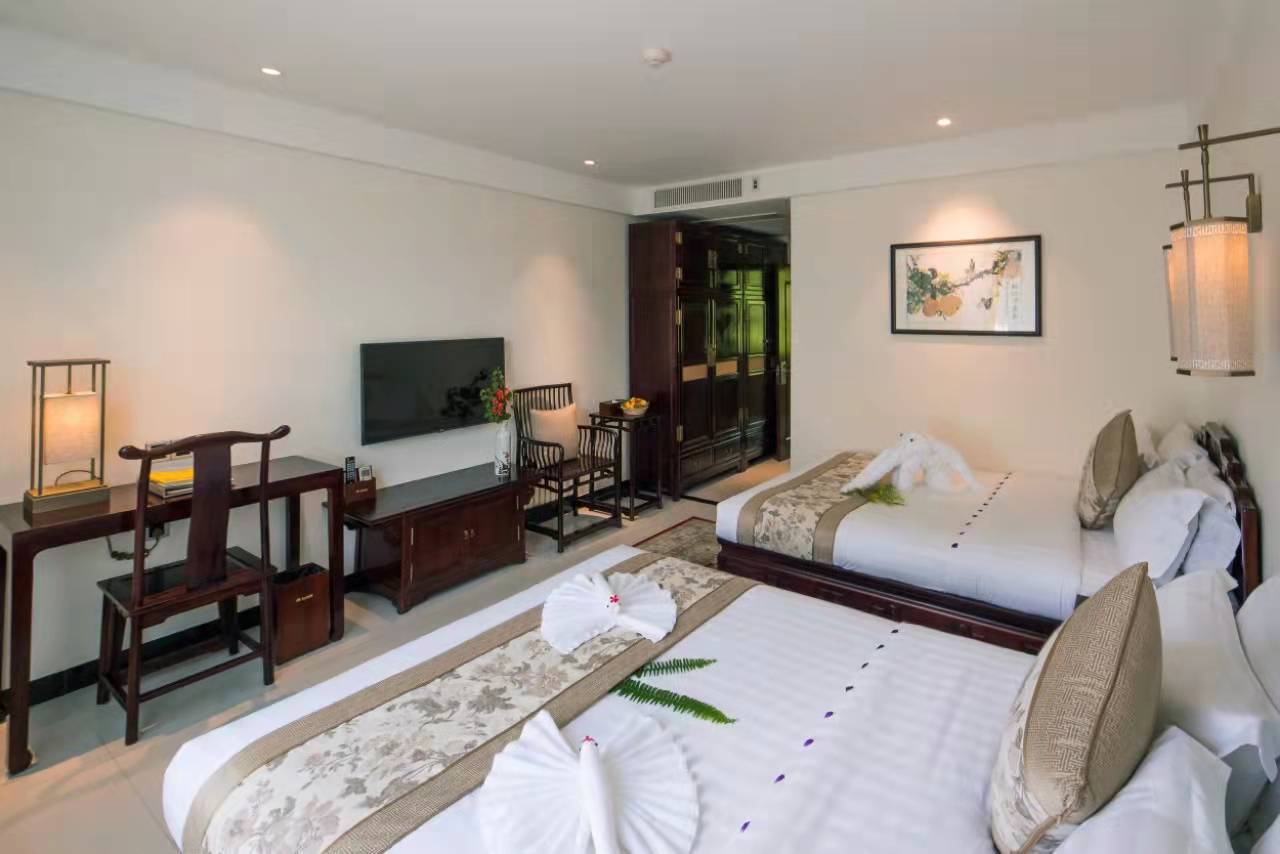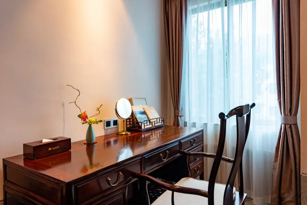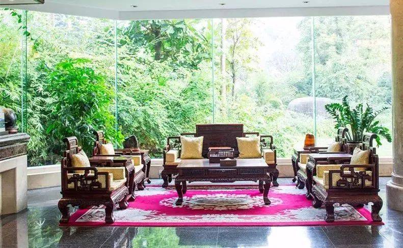 客房内环境幽静、设施齐全且配备全套大红酸枝红木家私。