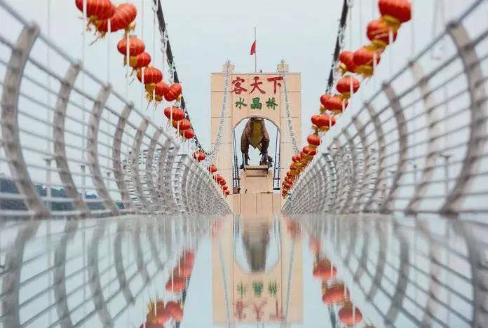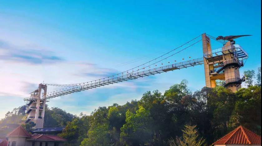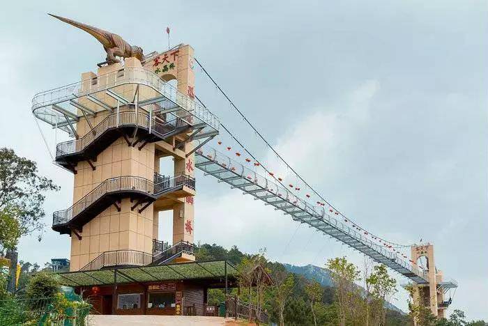 恐龙水晶桥横跨客天下两座山峰,群山环绕,气势磅礴!恐龙水晶桥全长288米,高约100米!