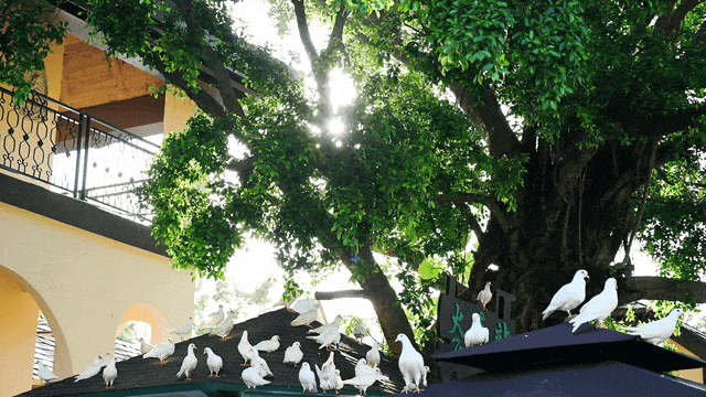 茶溪谷广场上成群的鸽子在木屋上盘旋,