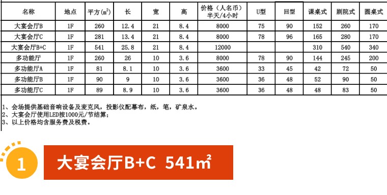 会议形式(容纳人数):课桌310,剧院540,圆桌型340