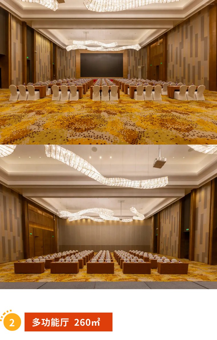 酒店一层设有可分作3个厅使用大型宴会厅,面积831㎡可同时容纳800人开会;另设有3间多功能厅,面积共245㎡,可同时容纳240人开会;此外还配备有董事会议室、贵宾室等,让工作、度假相得益彰。