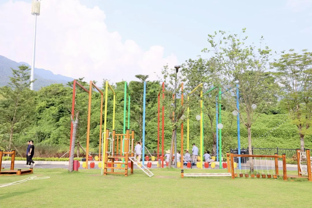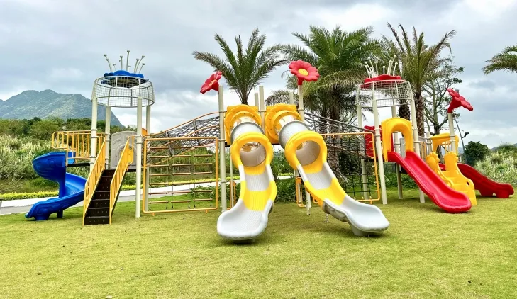 户外儿童游乐区位于酒店内大草坪,有适合小朋友游玩的无动力设施,大大小小的加起来不下10几种,比如不同高度、不同形状的滑梯,各种各样的攀爬网,高低错落的攀岩墙,趣味十足的小滑索等,样样都不缺,打眼一看,绝对算是孩子们的天堂了。