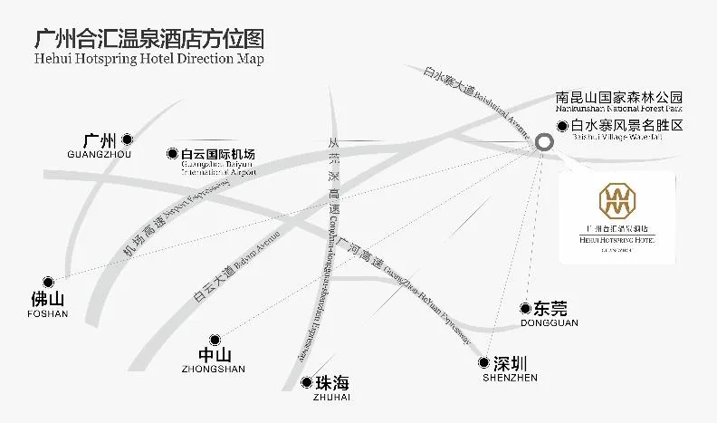 酒店位于广州市增城区,距离广州1小时车程。毗邻北回归线上的瑰丽翡翠——国家4A旅游风景区增城白水寨,步行可达景区入口。